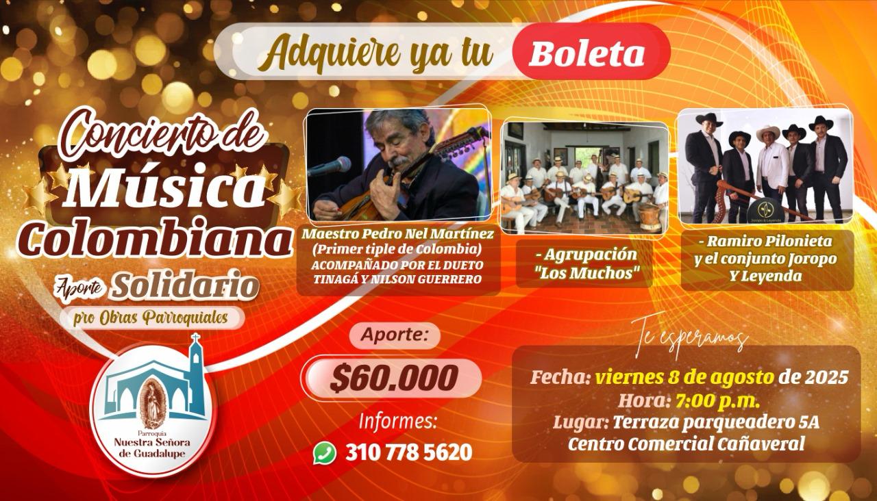Homenaje a la música colombiana este viernes 8 de agosto en la terraza del parqueadero 5A del Centro Comercial Cañaveral, un concierto promovido por la Parroquia Nuestra Señora de Guadalupe como iniciativa solidaria para la financiación de obras parroquiales.