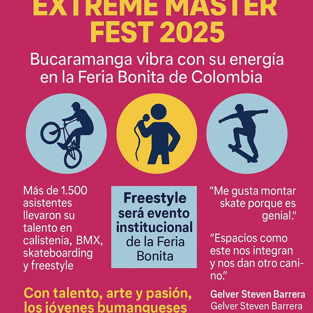 Bucaramanga celebró una jornada histórica durante la Feria Bonita de Colombia 2025 con el Extreme Master Fest, un evento que convirtió al Parque Extremo San Martín en el epicentro nacional de la cultura urbana, el deporte extremo y la creatividad juvenil. Organizado por el Instituto de la Juventud, el Deporte y la Recreación de Bucaramanga (INDERBU), el festival reunió a más de 1.500 asistentes en una fiesta de integración donde los jóvenes fueron protagonistas absolutos.