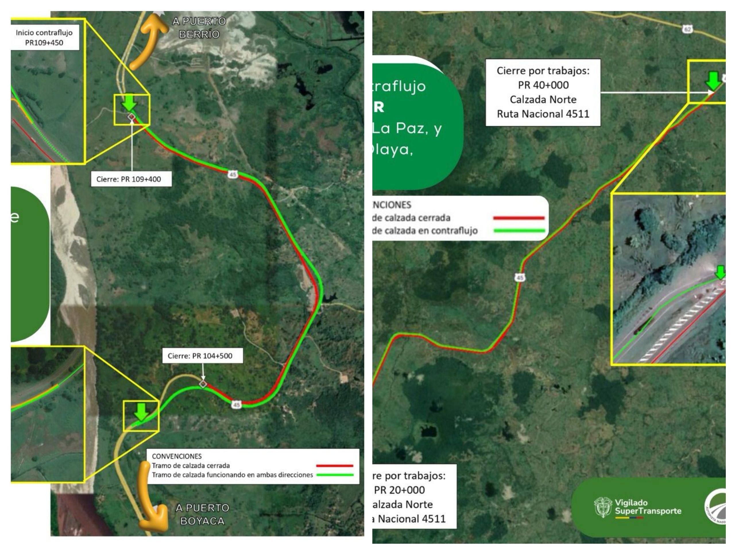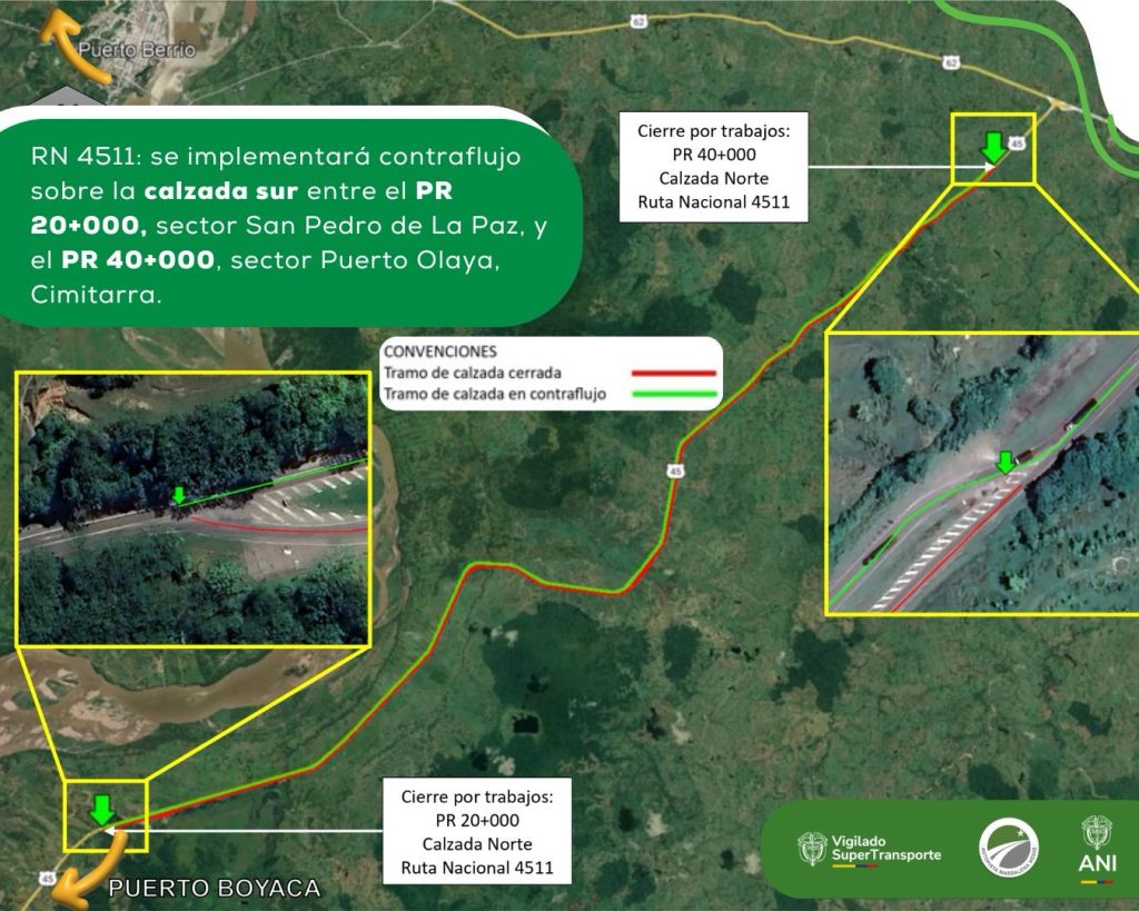 • En la Ruta Nacional 4511, se implementará contraflujo sobre la calzada sur entre el PR 20+000, sector San Pedro de La Paz, y el PR 40+000, sector Puerto Olaya, en Cimitarra.