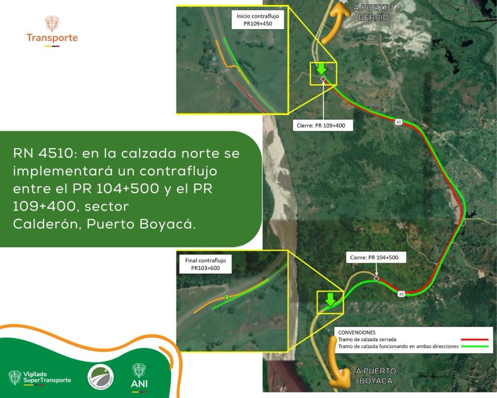 • En la Ruta Nacional 4510, la calzada norte se implementará un contraflujo entre el PR 104+500 y el PR 109+400, en el sector Calderón, en Puerto Boyacá.