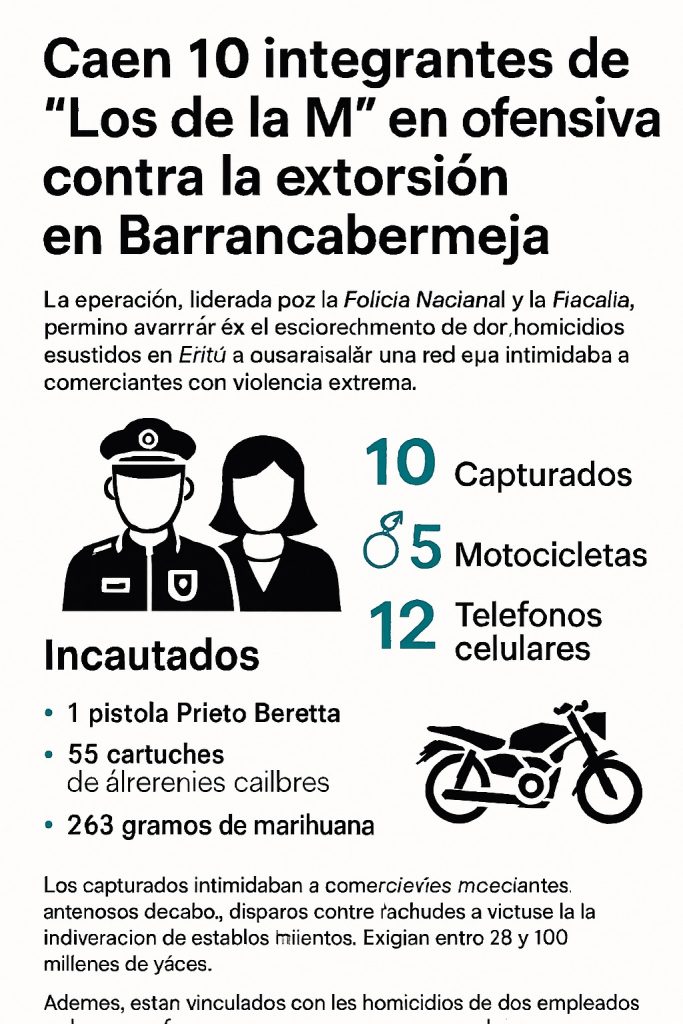 En el marco de la ofensiva nacional contra el multicrimen y la estrategia “Territorios Libres de Extorsión”, la Policía Nacional de los colombianos, en coordinación con la Fiscalía General de la Nación, el Gaula Militar y la Alcaldía de Barrancabermeja, logró la captura de diez presuntos integrantes del Grupo Delincuencial Común Organizado (GDCO) “Los de la M”, responsables de múltiples hechos de extorsión en el distrito.