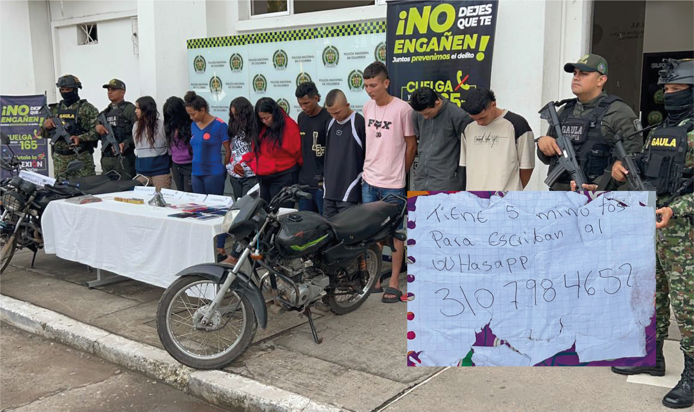 La operación se desarrolló mediante cuatro diligencias de registro y allanamiento, en las que fueron capturados por orden judicial y en flagrancia los siguientes sujetos: alias “Mami”, “Modo avión”, “Marly”, “Pimienta”, “Peñate”, “Brayan”, “Pereira”, “Jacsury”, “Danny” y “Erika”. Los delitos que se les imputan incluyen extorsión agravada, concierto para delinquir agravado, porte ilegal de armas de fuego, tráfico de estupefacientes y homicidio.