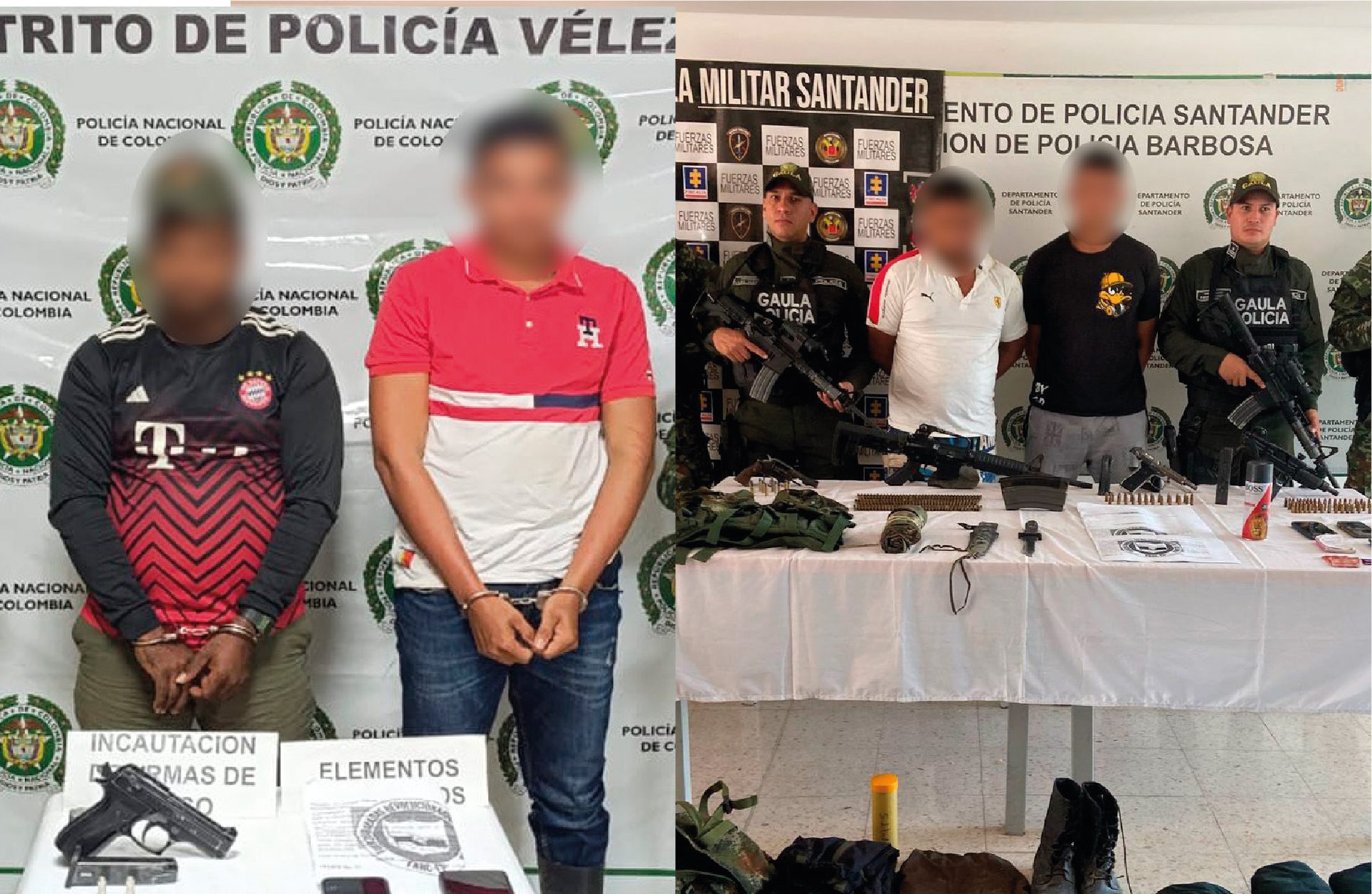 De esta manera eficaz y oportuna, unidades de Policía y del Ejército Nacional desplegaron un operativo de verificación, ubicando a los sujetos en la ribera del río Oponcito. Dentro de los elementos y material bélico incautado en los dos operativos se destaca, armas de largo y corto alcance, municiones, una motocicleta, celulares y sincard, panfletos alusivos a un Grupo Armado Ilegal y aerosoles utilizados para realizar los grafitis. Llamó la atención de las autoridades un fusil M4 COLT, y una mini Uzi. Según el acervo probatorio recolectado en las investigaciones, permite la inferencia razonable que los capturados No hacen parte de un Grupo Armado Organizado (GAO), no obstante, estas personas estarían usando el nombre de un grupo armado ilegal para generar temor, con el fin de extorsionar a la población de la provincia de Vélez Santander.
