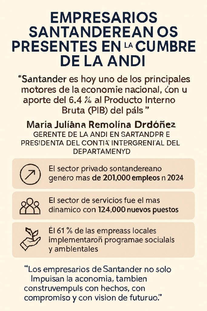 “Santander es hoy uno de los principales motores de la economía nacional, con un aporte del 6,4 % al Producto Interno Bruto (PIB) del país”, destacó María Juliana Remolina Ordóñez, gerente de la ANDI en Santander y presidenta del Comité Intergremial del departamento. Durante la Cumbre, Remolina subrayó que el sector privado santandereano generó más de 201.000 empleos en 2024, siendo el de servicios el más dinámico con 124.000 nuevos puestos. Además, el 61 % de las empresas locales implementaron programas sociales y ambientales, desde iniciativas contra la inseguridad alimentaria hasta el fortalecimiento del tejido social. “Los empresarios de Santander no solo impulsan la economía; también construyen país con hechos, con compromiso y con visión de futuro”, afirmó.