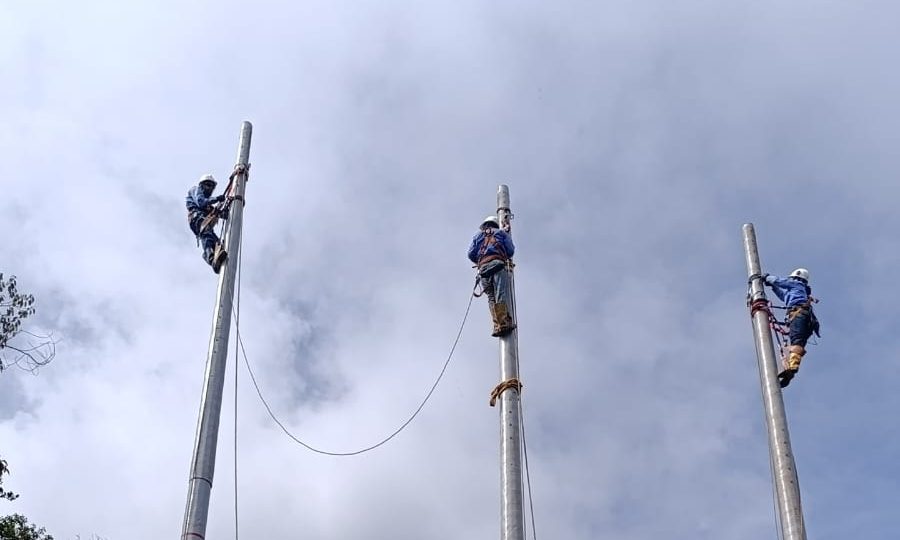 Desde tempranas horas, decenas de trabajadores enfrentan los desafíos climáticos y geográficos de la zona para levantar las torrecillas que permitirán el trazado provisional de la línea de alta tensión. A esta hora, el equipo técnico reporta avances significativos: