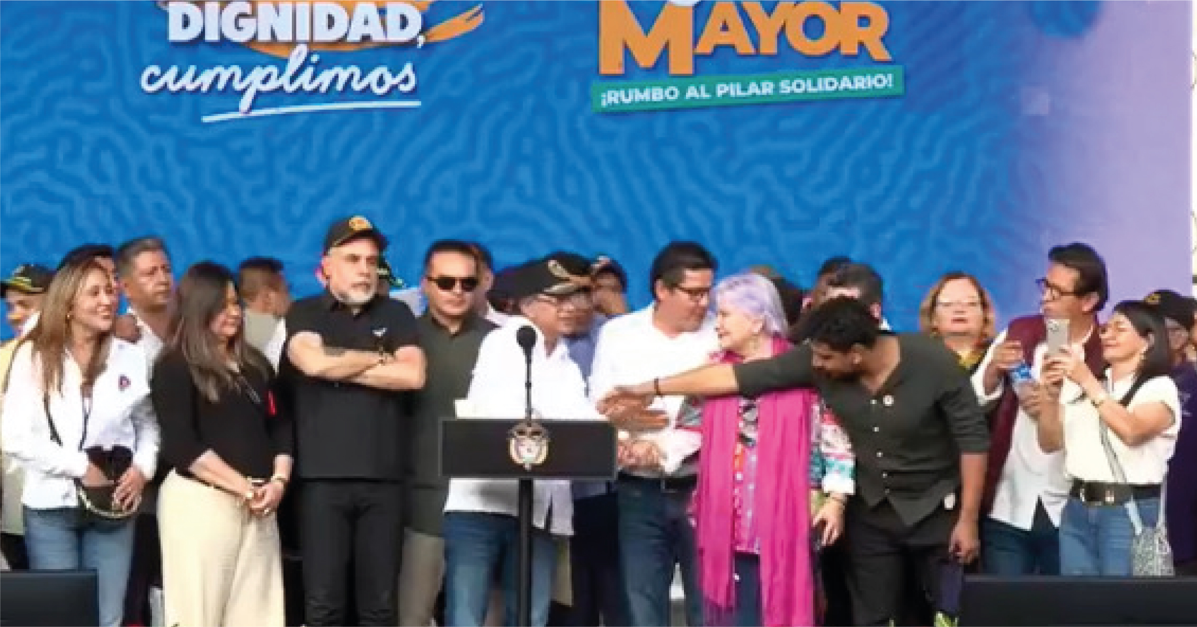 Durante los 40 minutos que permaneció en la tarima, Petro estuvo acompañado por varios ministros y funcionarios del gabinete, en el marco del lanzamiento de la estrategia “Dignidad Mayor”, que busca ampliar los subsidios para adultos mayores en situación de vulnerabilidad. El acto incluyó anuncios sobre el aumento en las transferencias del programa Colombia Mayor, que pasarán de 80 mil a 230 mil pesos mensuales para mujeres mayores de 70 años y hombres mayores de 75.