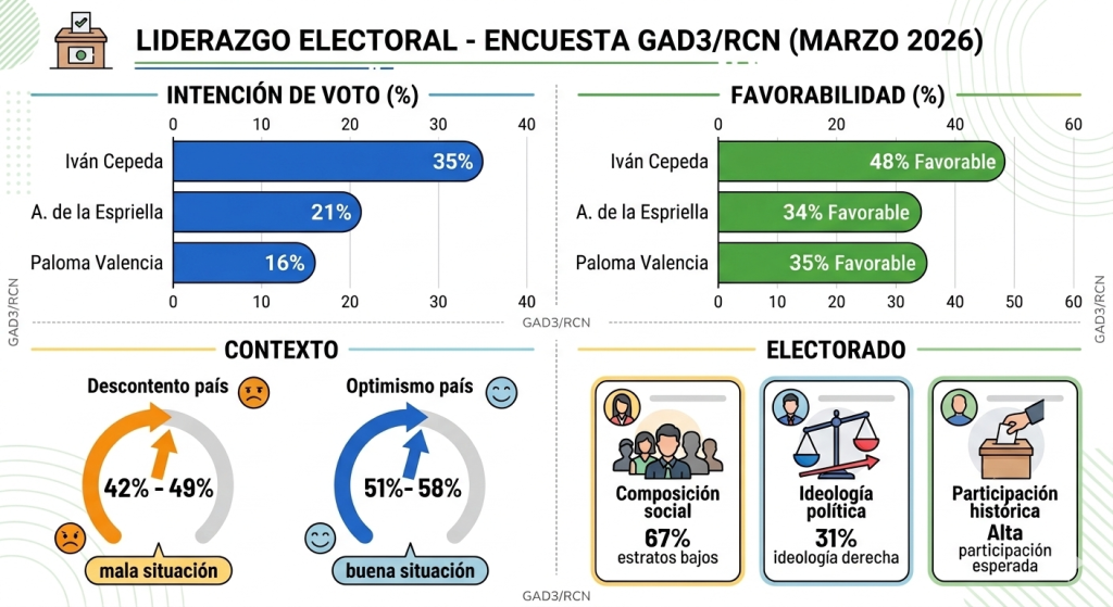 La encuesta realizada por GAD3 para RCN, entre el 16 y 18 de marzo de 2026, dibuja un escenario electoral tenso para las presidenciales colombianas, con fuerte desaprobación al gobierno actual (42-49% califica la situación nacional como mala en política, economía y social) y un electorado fragmentado donde predominan los estratos bajos (67%) pese a un 31% de ideología de derecha.